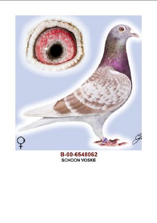 Die B-00-6548062 w "Tochter des Vos von 1998" ist ein Original Weibchen der Gebrüder Janssen aus Arendonk. Sie stammt aus der Linie des 019. Der 019 stammt aus dem Oude Merckx von 1967. Beide Tauben errangen jeweils 18 x den 1. Preis in Arendonk.
